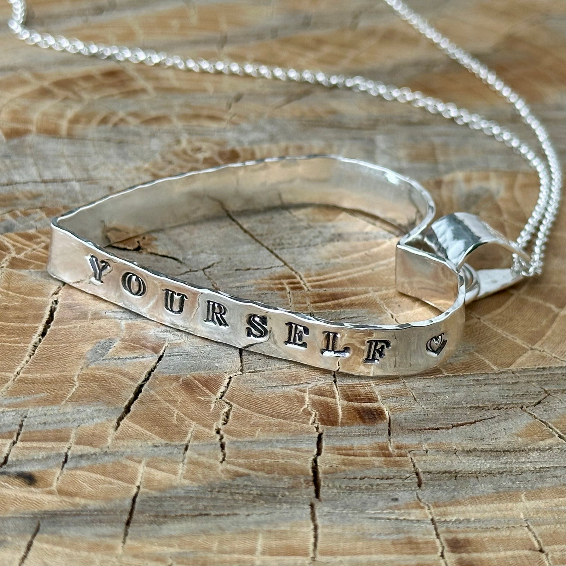 Stamped with “Be Kind to Yourself,” this piece carries a gentle, powerful message meant to be close to your heart. Bold in scale yet meaningful in sentiment, it’s a necklace designed to be worn as a daily affirmation.