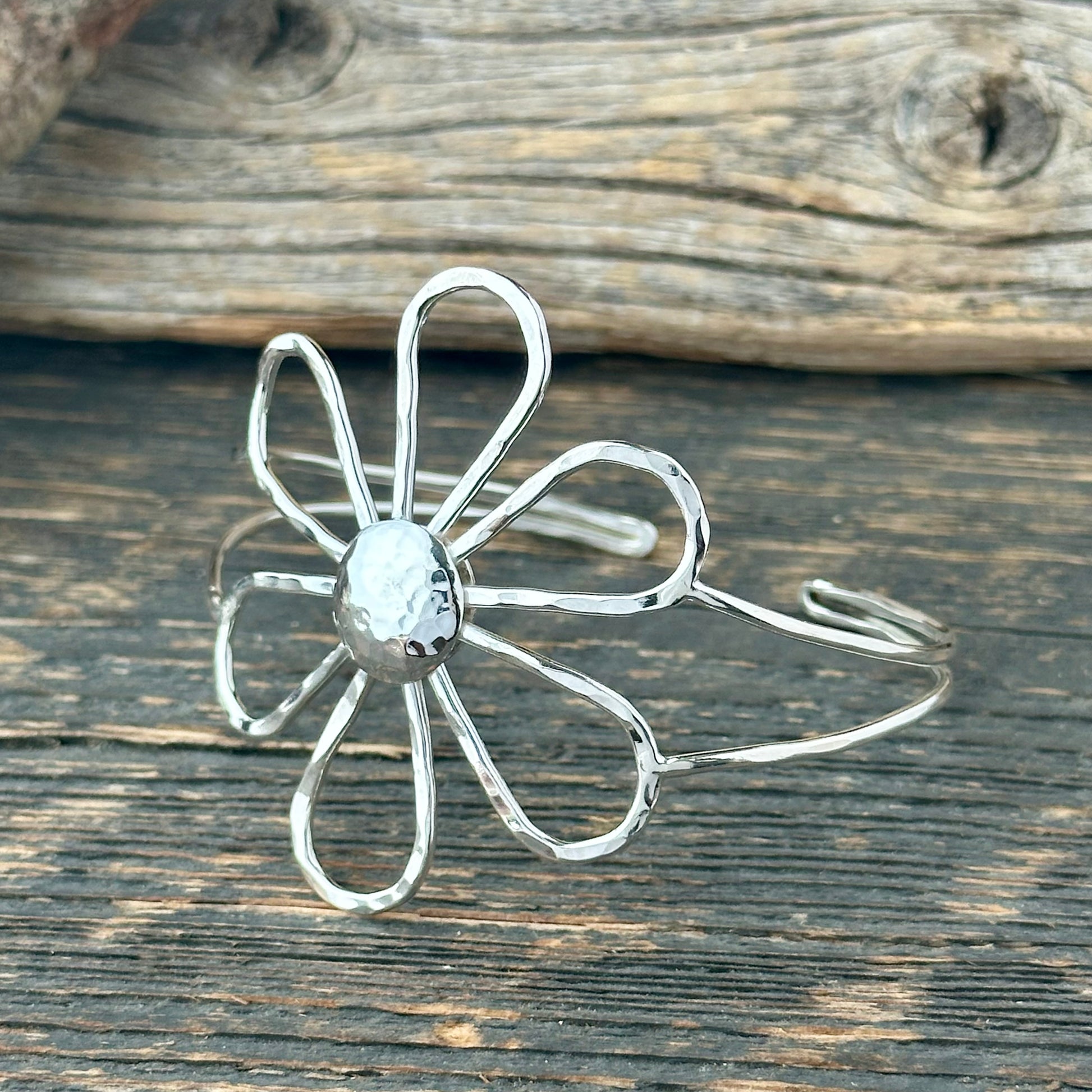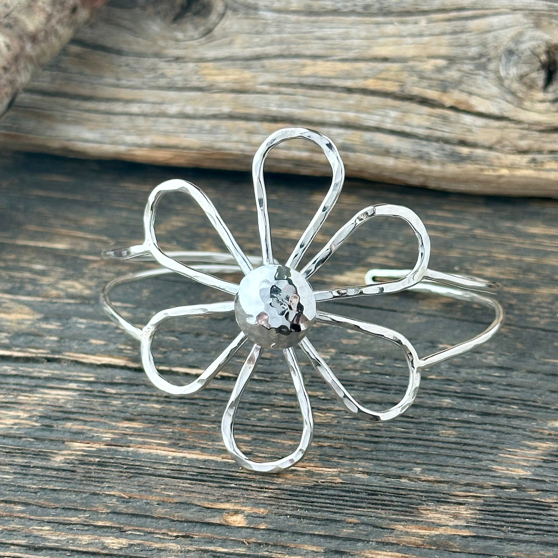 Crafted in sterling silver with a bright, hammered texture, this bracelet reflects the light with every move. At its heart is a striking hand-sculpted flower, measuring 2 inches across — full of depth, texture, and personality. It’s a piece that brings confidence and joy, like a wearable burst of sunshine.