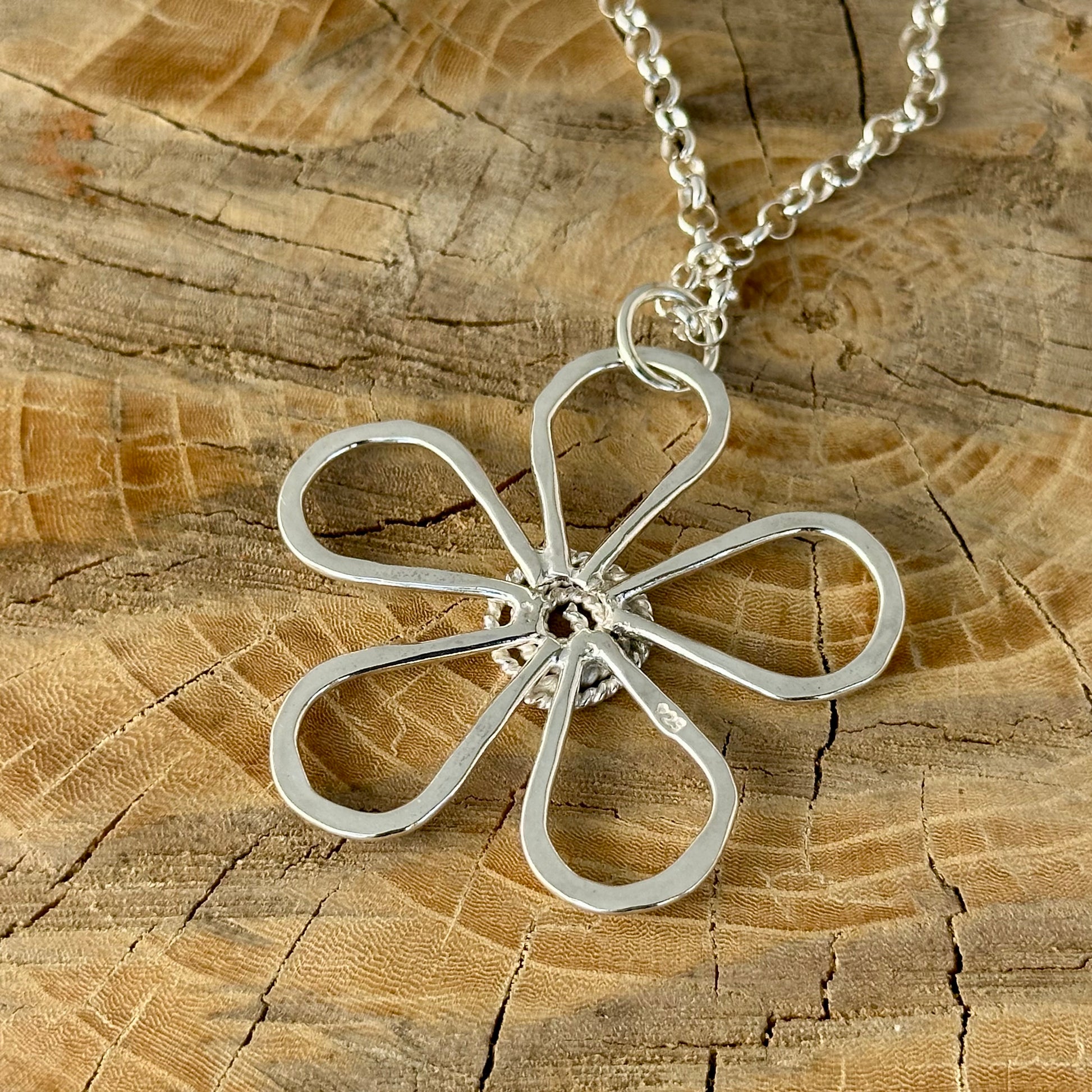 This beautiful sterling silver flower pendant is entirely handmade in my studio. Each petal is shaped and hammered by hand to create a bright, light-catching texture that shimmers with every movement. The centre features a delicate twisted silver wire, adding a touch of organic depth to the design.