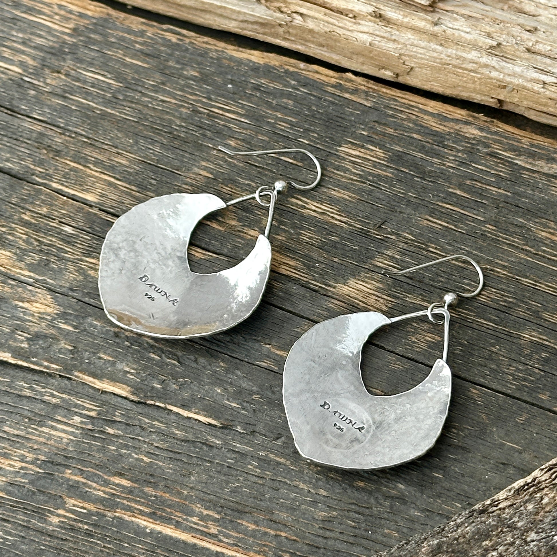 These earrings feature a graceful swirl design with richly hammered texture and a soft patina that brings out every detail — all handcrafted in sterling silver for a distinctive boho feel.