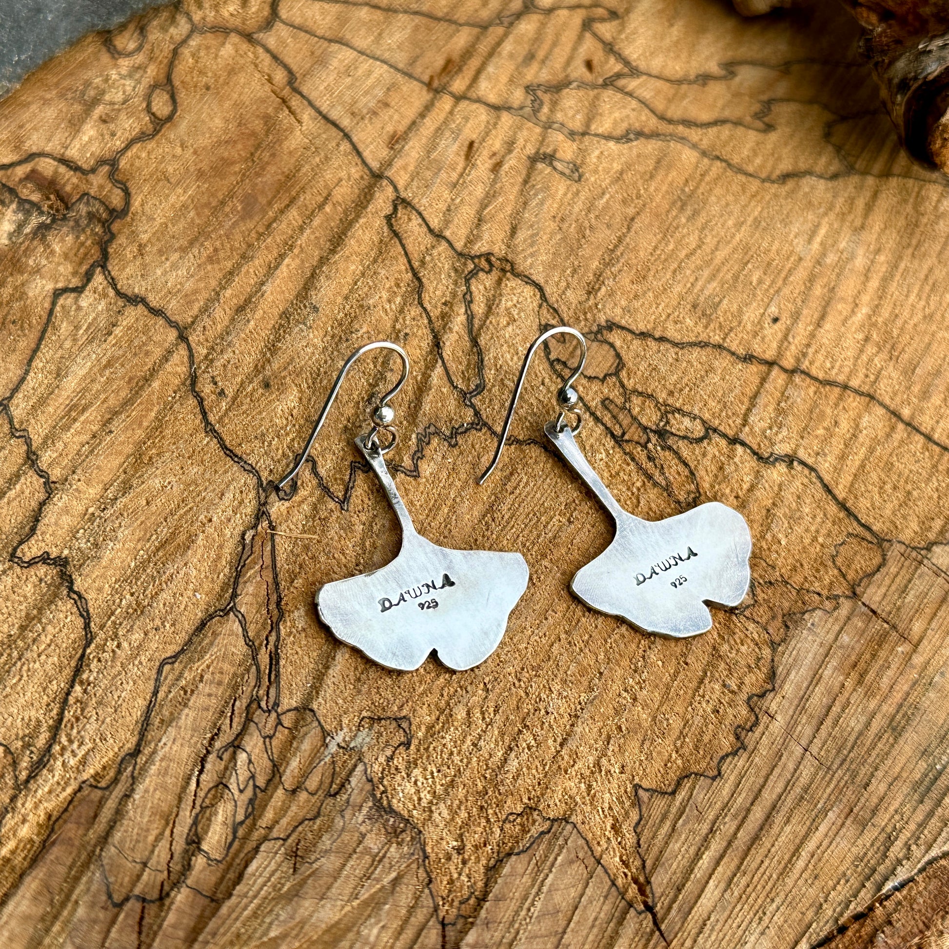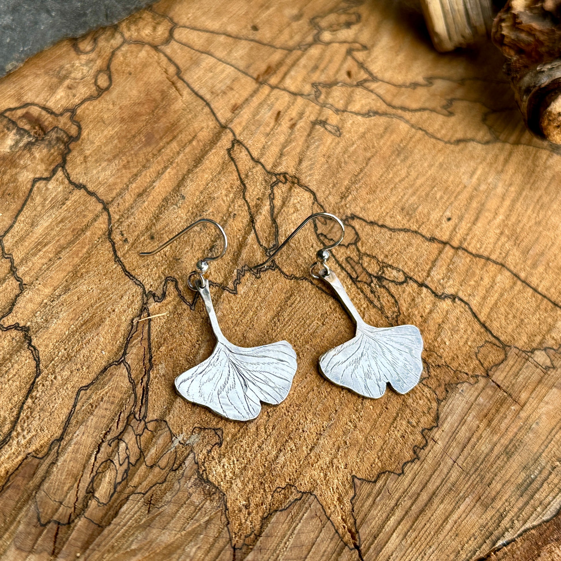 These delicate ginkgo earrings are handcrafted from sterling silver, featuring an etched satin texture and a subtle patina that beautifully highlights their natural design. Including the ear wires, they measure 1.75 inches long—perfect for adding a touch of nature-inspired charm to any outfit.