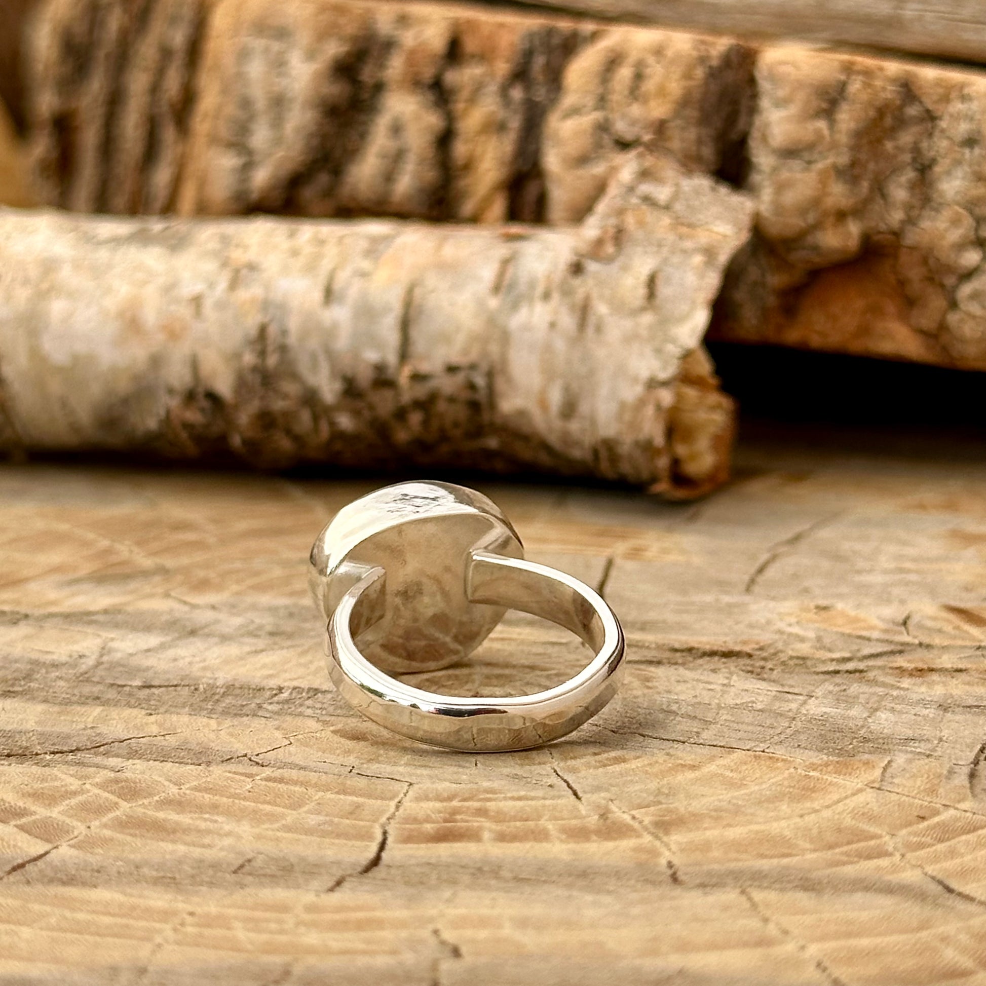 This handcrafted sterling silver ring features a captivating fire agate that glows with shimmering tones of orange, gold, and earthy depth. As the light shifts, the stone reveals hidden patterns and flashes, like sparks dancing in a flame.