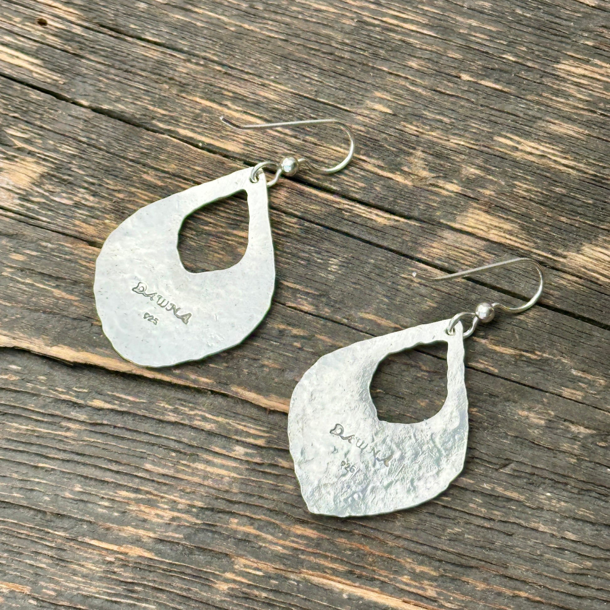 These earrings feature a richly hammered texture that catches the light beautifully — all handcrafted in sterling silver.