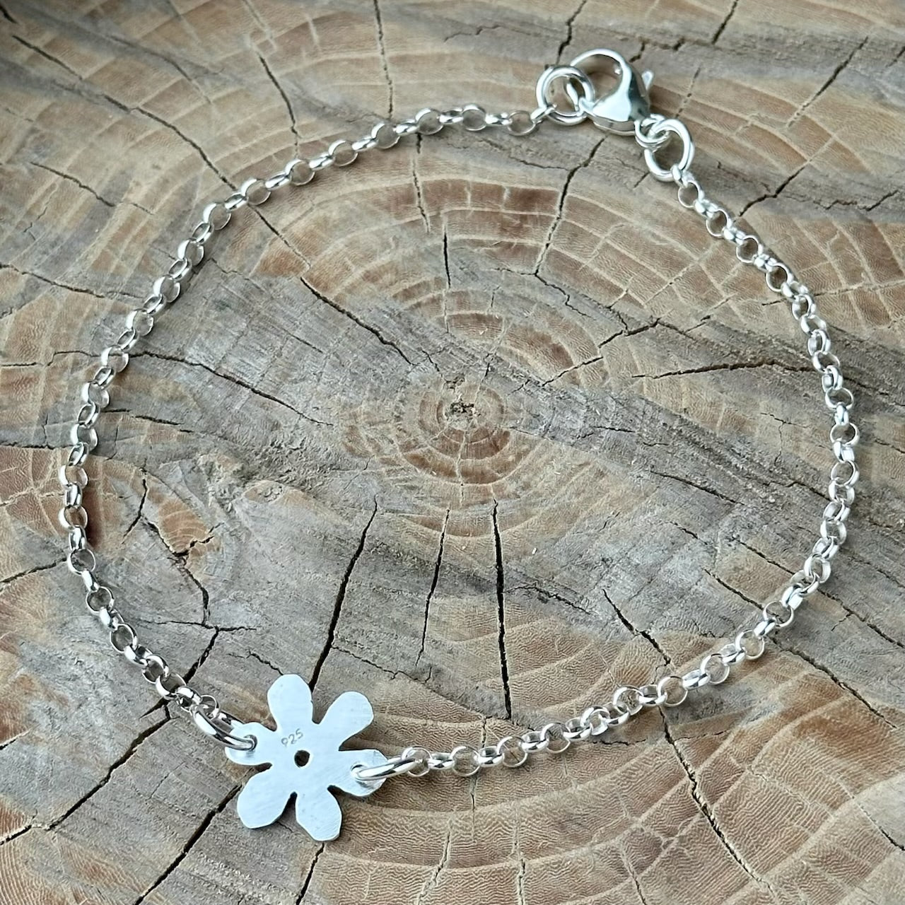 A hand-cut sterling silver flower is the heart of this anklet — bright, cheerful, and full of texture. The hammered surface catches the light with every step, adding a hint of shimmer to your summer days.