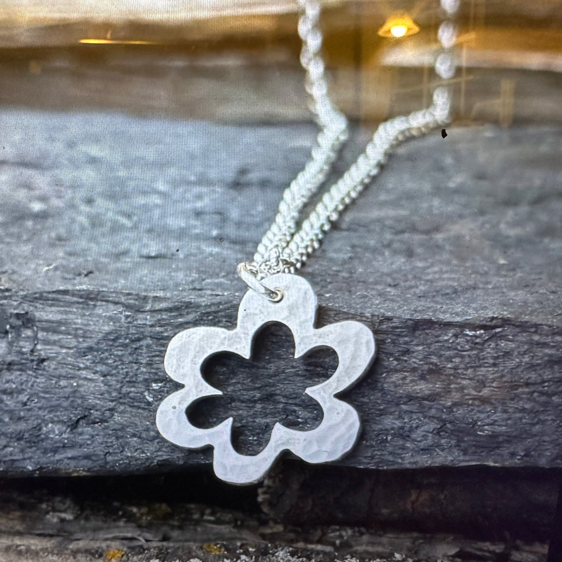 A Hand-Cut flower, carved by hand to give the piece a soft, natural charm. The pendant has a a bright satin sheen, and a hammered texture that adds depth and character to the surface.