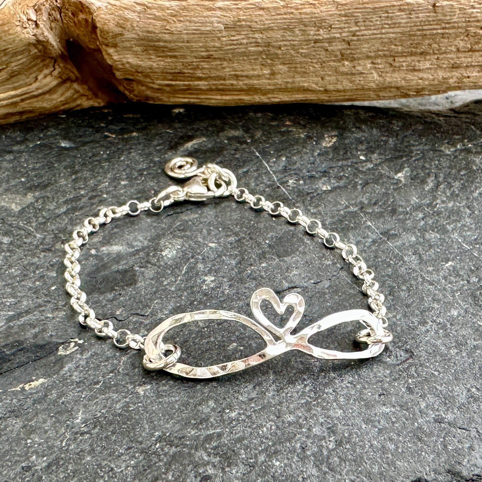 Handcut Sterling Silver Heart & Infinity Bracelet – Bright Hammered Finish