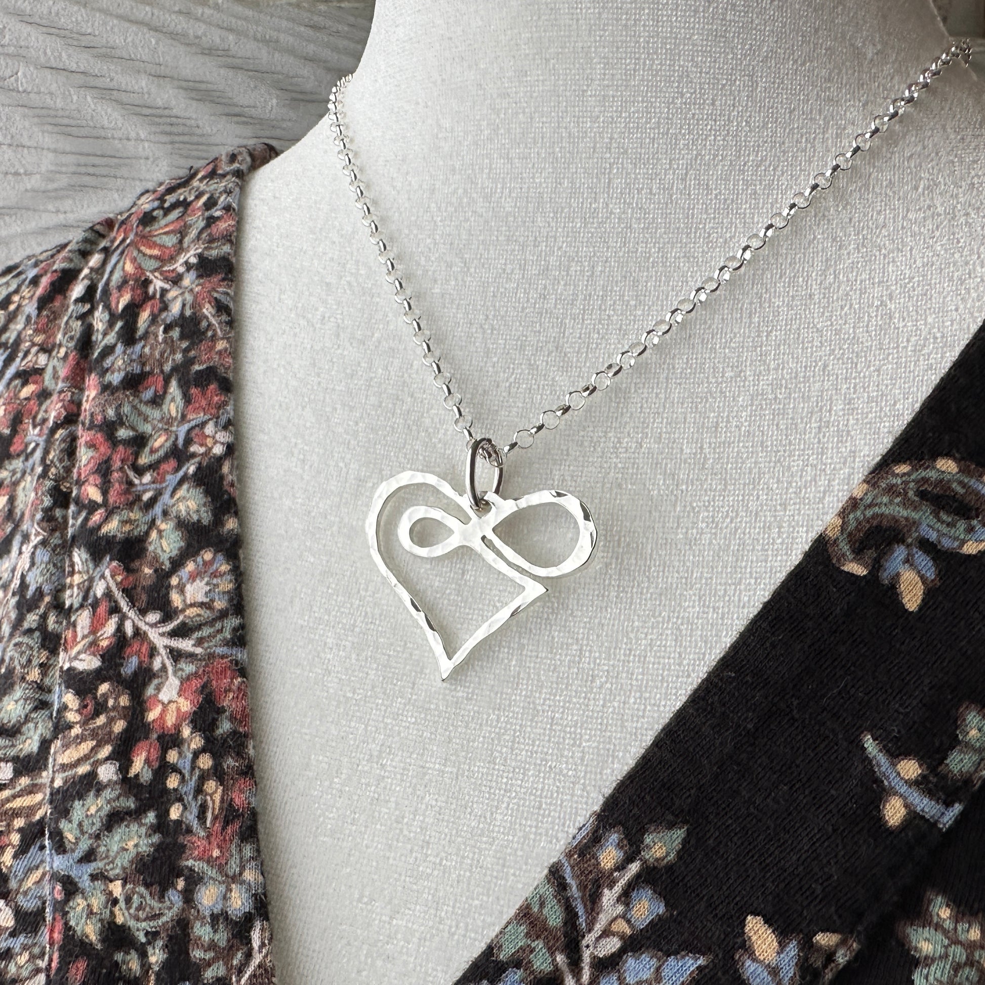 Handcut Sterling Silver Heart & Infinity Necklace – Bright Hammered Finish