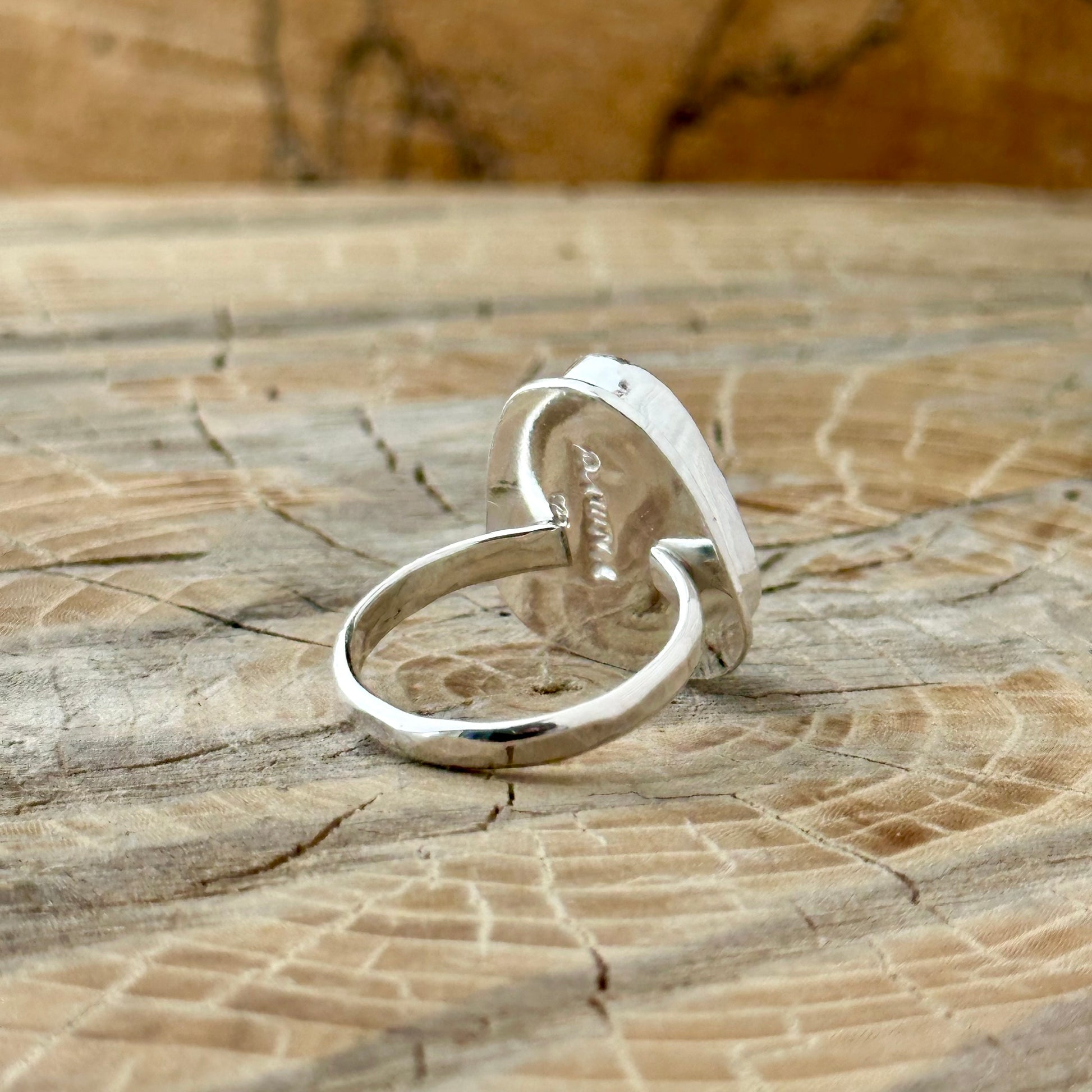 Sized at 8, it’s crafted for comfortable everyday wear while highlighting the artisan detail that makes it truly unique. The hammered band adds a modern touch to this classic gemstone, creating a piece that balances natural beauty with handcrafted charm.