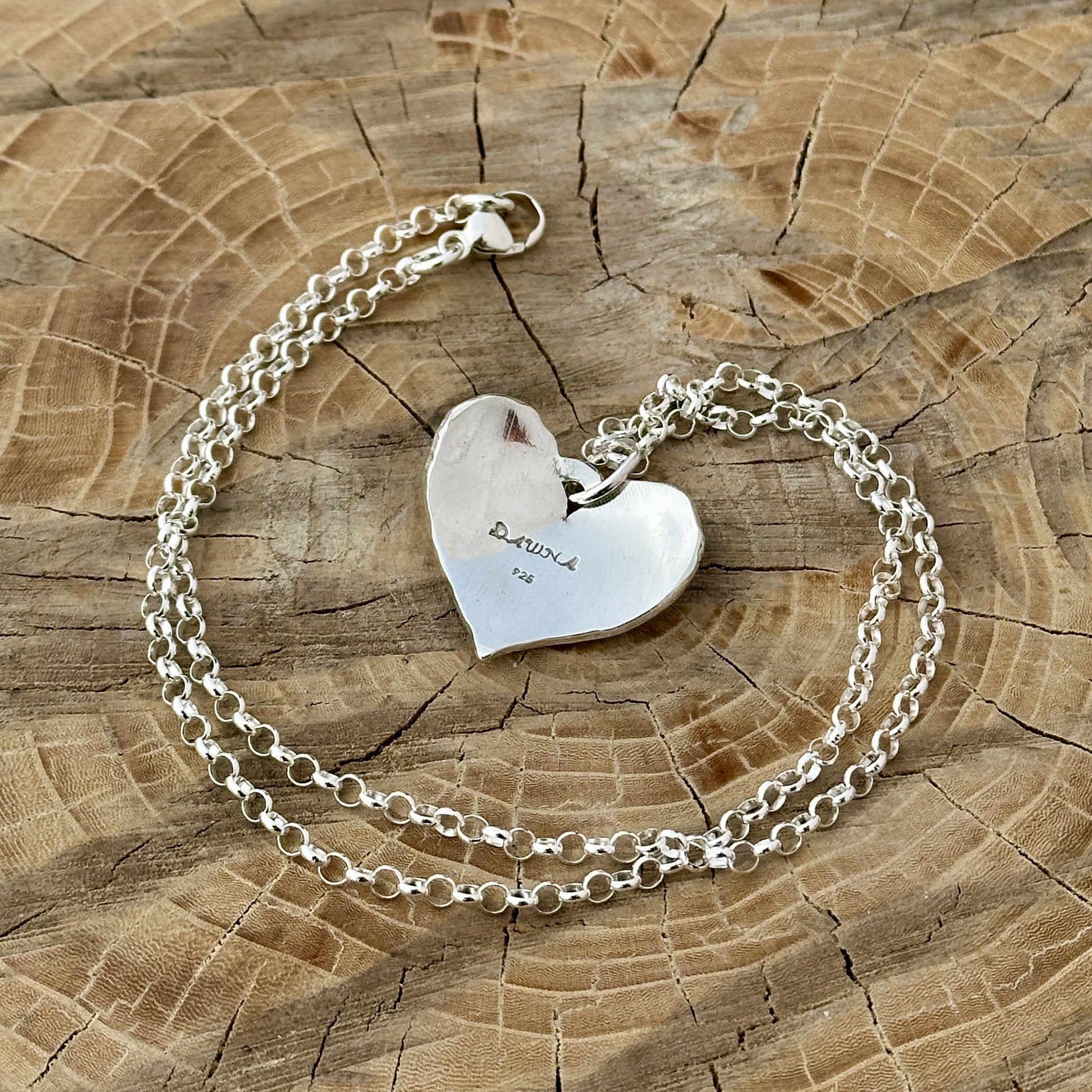 Sterling Silver Heart: A handcrafted heart pendant measuring 1 x 1 inch, made with care and intention.