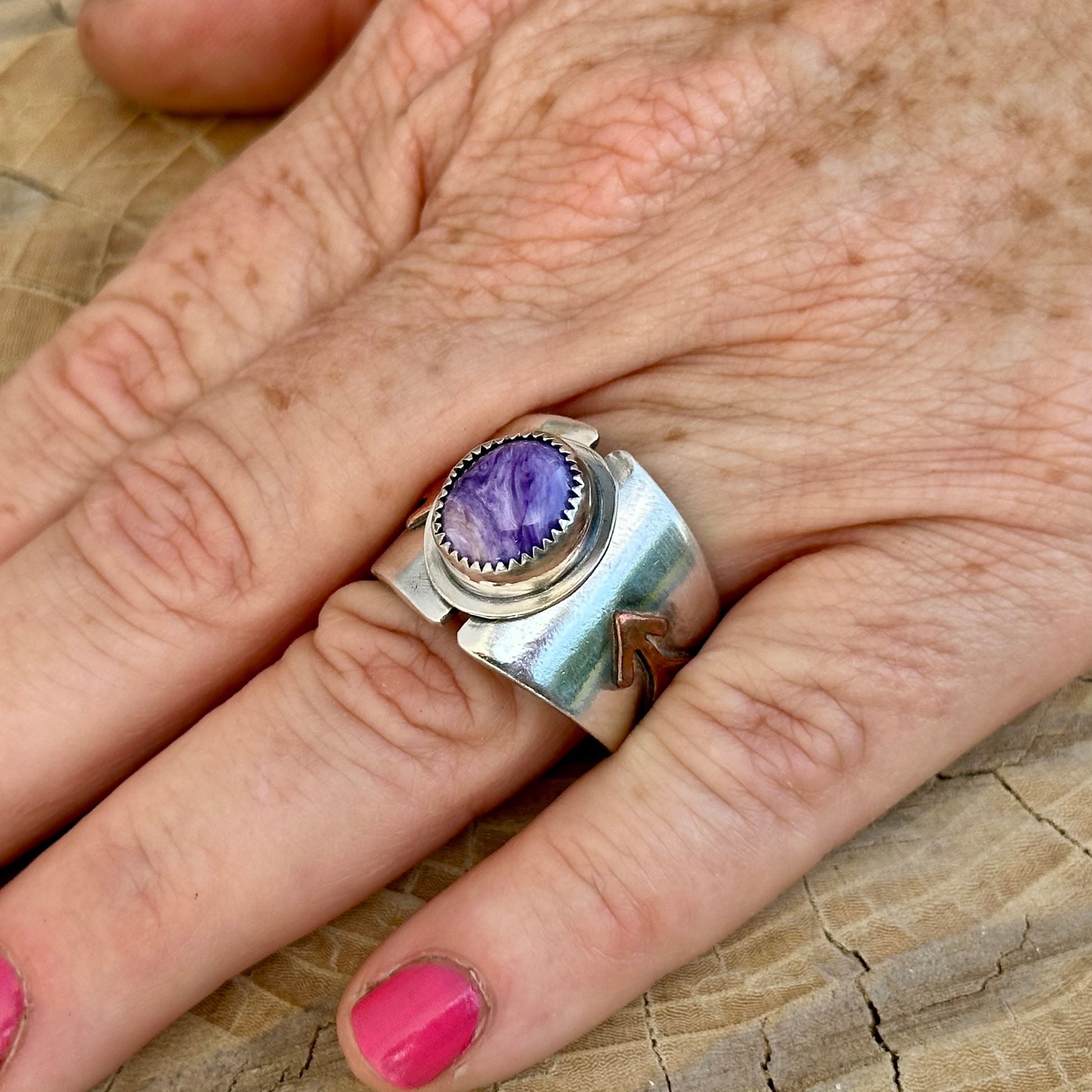This bold, handcrafted ring features a striking piece of natural Charoite—known for its rich swirls of purple that feel both powerful and serene. A hand-cut copper arrow accents the band, adding warmth, symbolism, and a touch of the unexpected.
