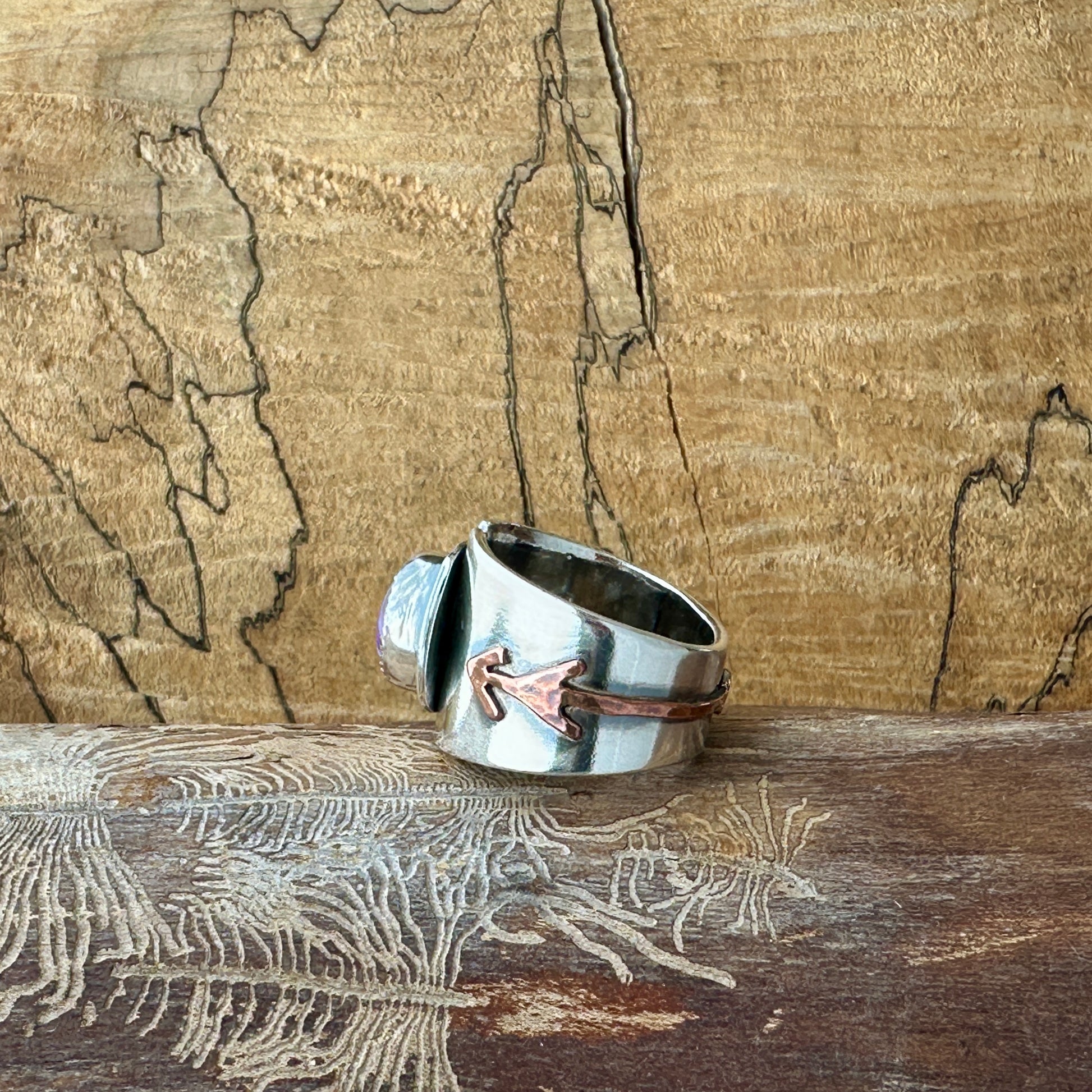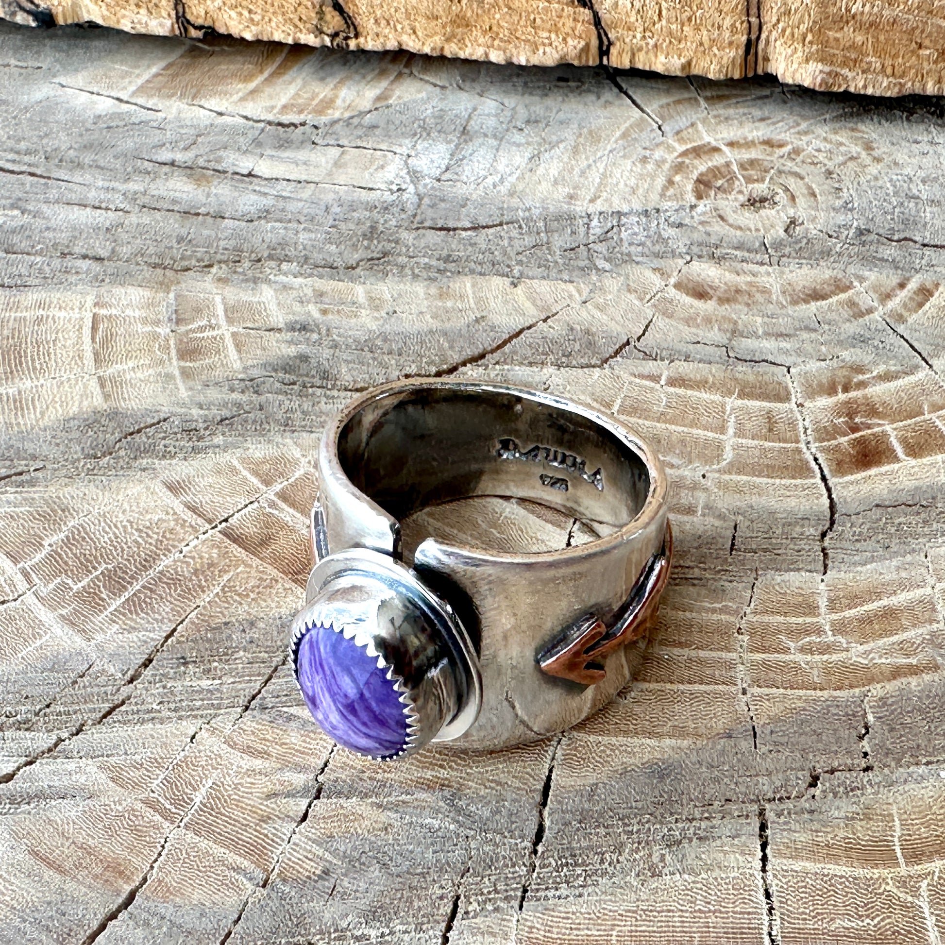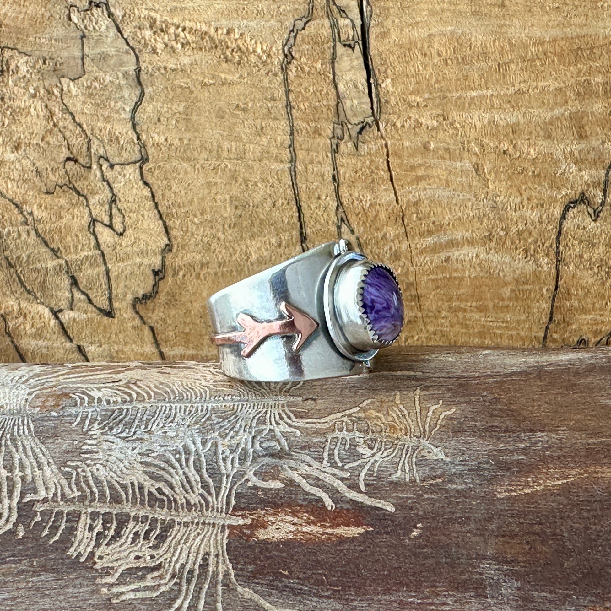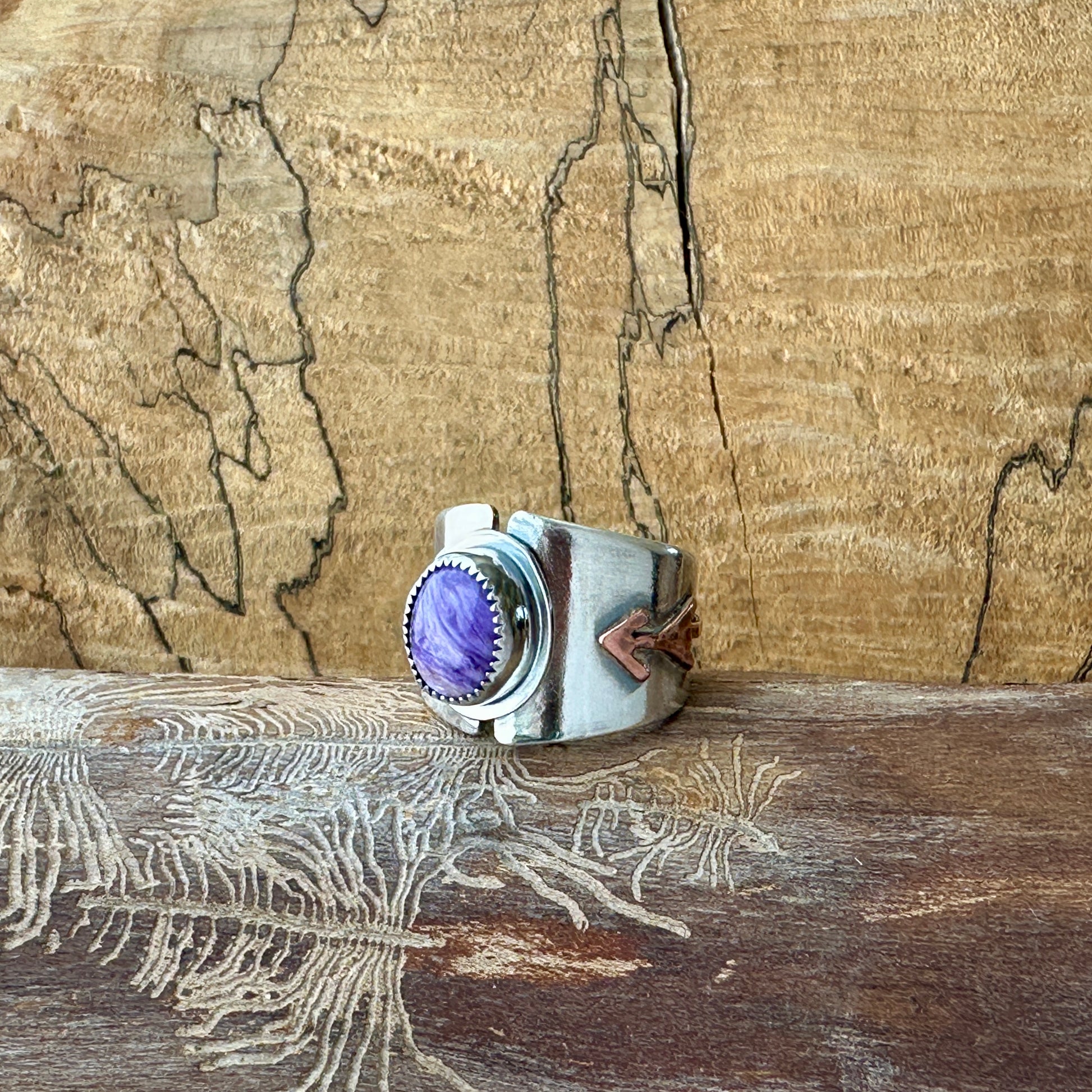Sterling Silver Ring with Charoite & Copper Arrow – One of a Kind