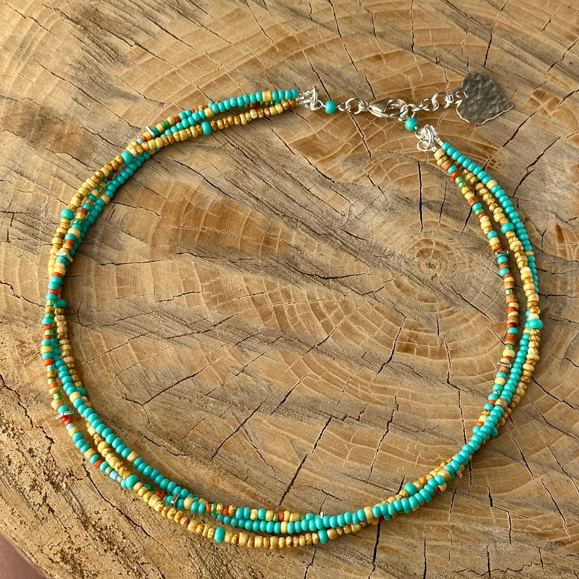 Designed with a layered look you love, this necklace features three strands of glass seed beads paired with a hammered sterling silver heart detail at the back. Every metal component is solid sterling silver, offering both beauty and lasting quality.