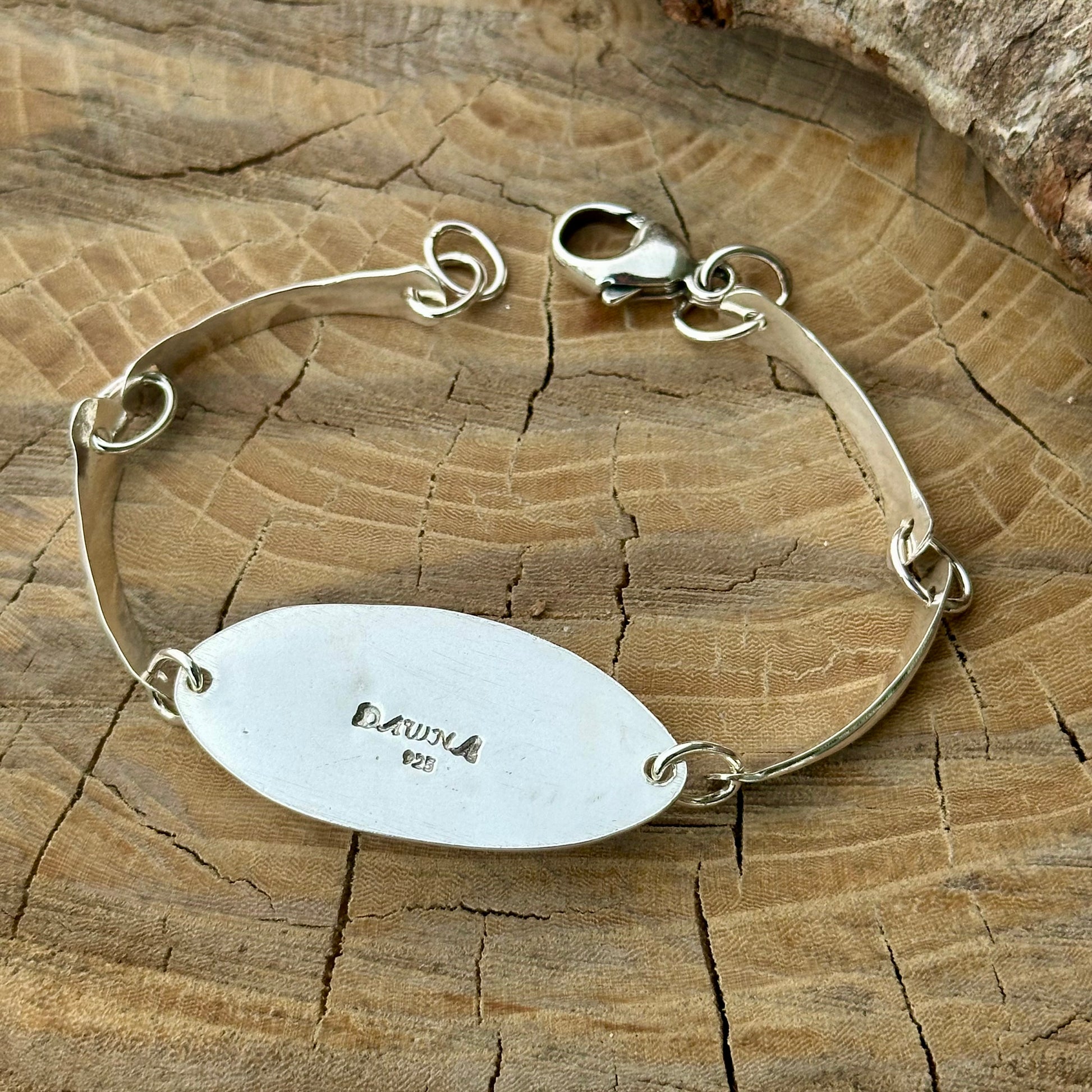 Each silver bar has been hand-forged in my studio south of Ottawa, giving the bracelet its unique rhythm and shine. The hammered finish catches the light beautifully, complementing the natural iridescence of the Labradorite—a gemstone known for its mystical play of color and protective energy.