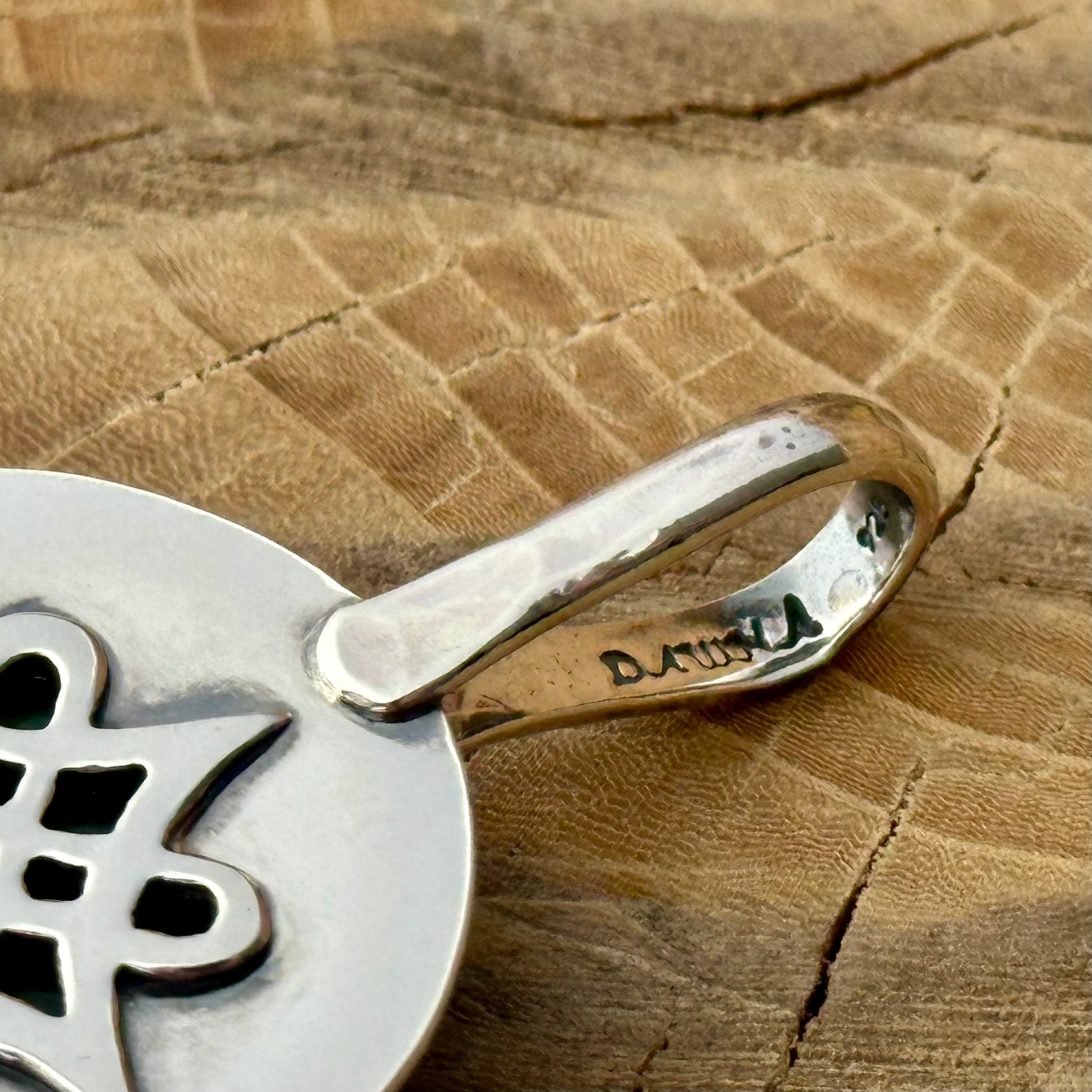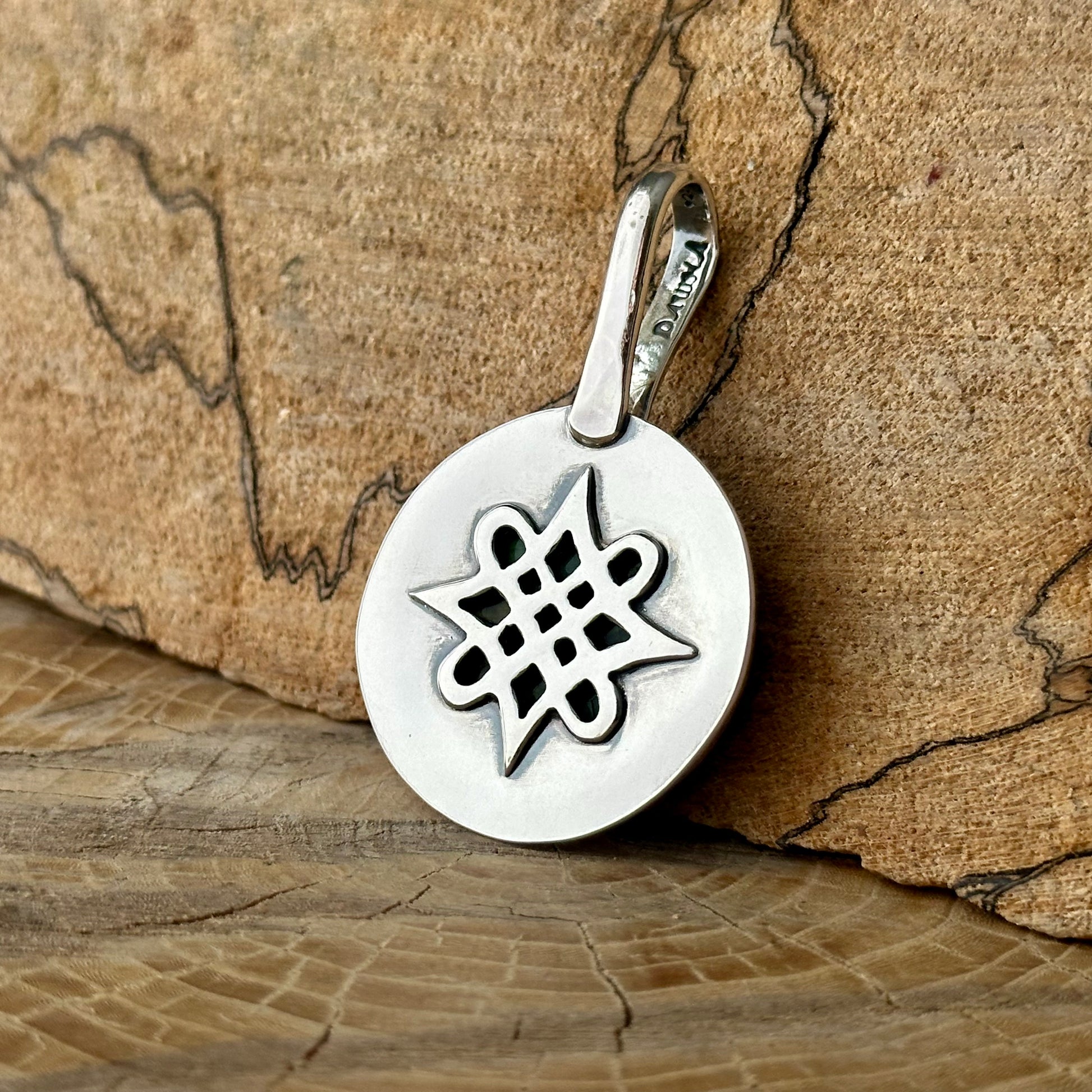 Finished with a soft satin sheen and a warm patina that enhances the texture and contrast, this pendant measures 2 inches long including the bail and can be worn either way for a completely different look.