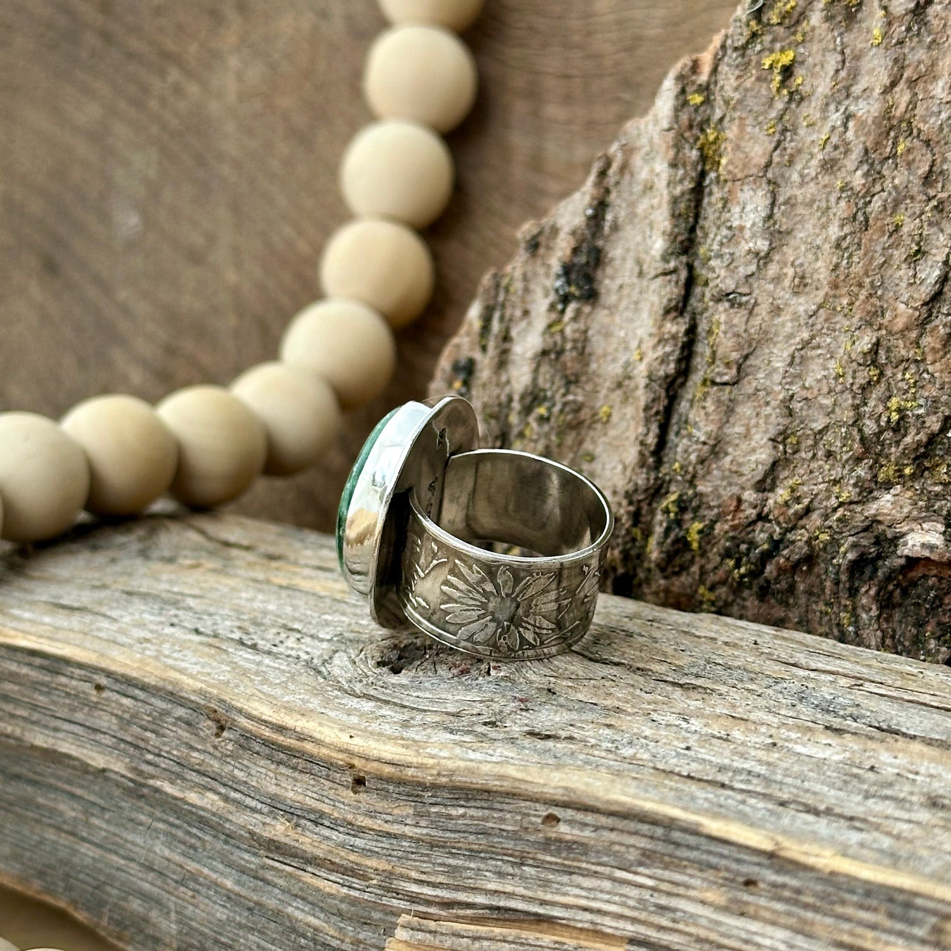 The band is a substantial 11.5 mm wide, offering a grounded, comfortable fit. Along the surface, delicate daisies have been etched into the silver — an unexpected detail that adds a touch of charm and balance to the boldness of the piece.