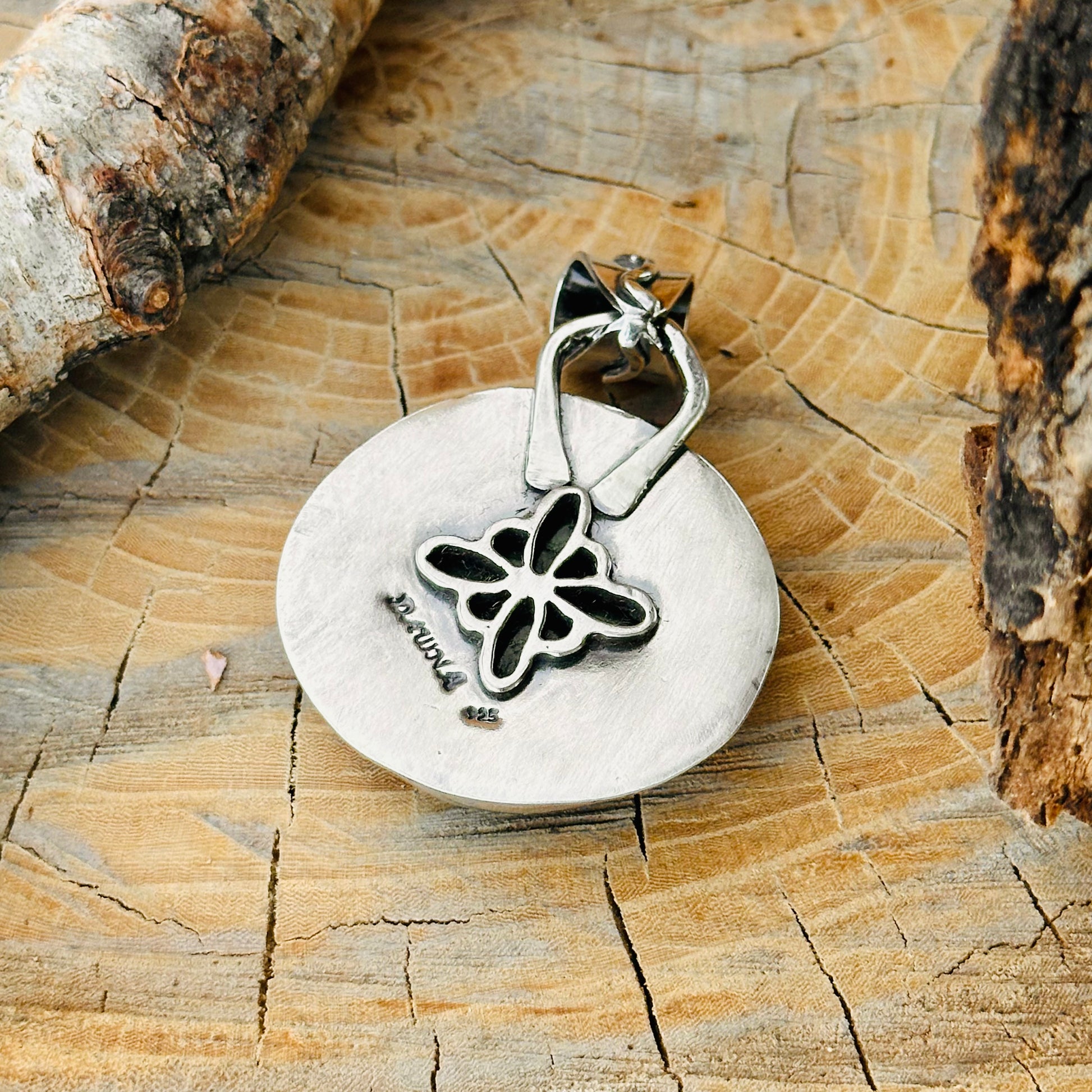 This captivating, one-of-a-kind sterling silver pendant features a smokey Labradorite that shimmers with mysterious flashes of light — a stone known for its depth, grounding energy, and quiet beauty. The back reveals a hand-cut design, allowing light to flow through the stone and highlight its natural iridescence from within.