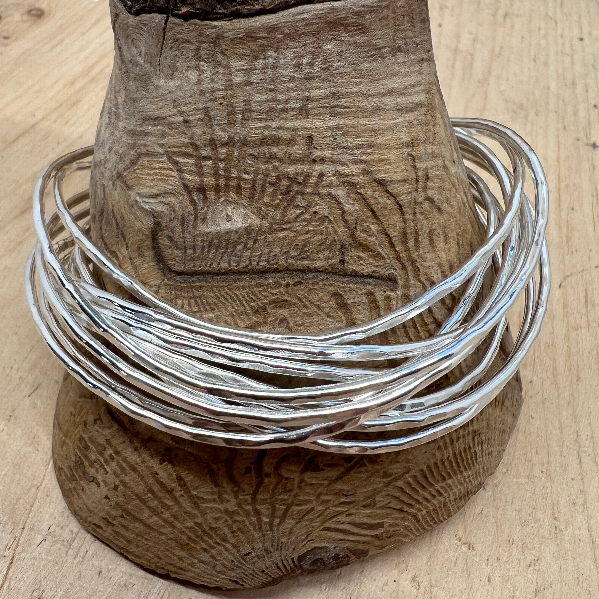 This elegant bangle is handcrafted from high-quality sterling silver, featuring a graceful wavy shape and a bright hammered texture that reflects the light beautifully. With an inside diameter of 2.75 inches, it offers a comfortable fit for most wrists.